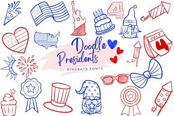 Doodle Presidents is a whimsical dingbat font that showcases adorable, hand-drawn icons inspired by U.S. presidents and symbols of the 4th of July. This font is ideal for infusing a patriotic flair into your projects, featuring fun doodles such as flags, fireworks, and historical figures. It’s perfect for cards, posters, and festive designs!